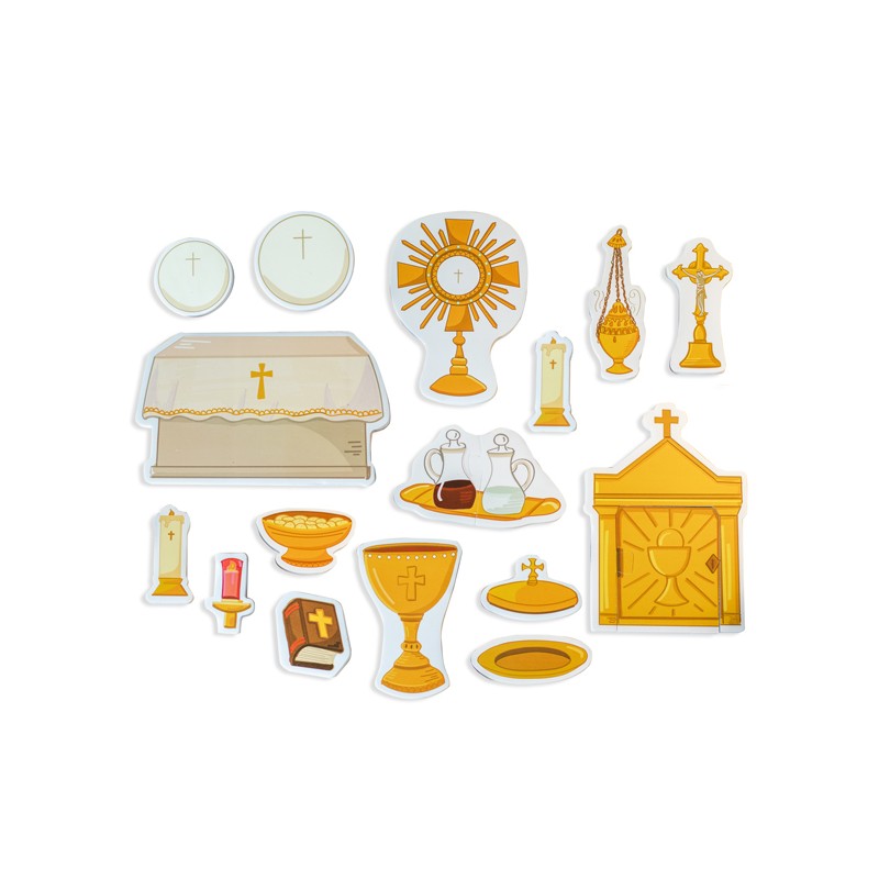 Ce set ludique comprend 21 pièces et un sac de rangement. Idéal pour initier les enfants aux objets liturgiques de la messe de façon douce et éducative.