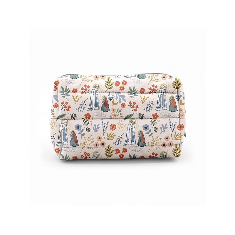 Emportez un symbole de foi et de douceur partout avec vous grâce à notre pochette matelassée Notre-Dame de Lourdes et Sainte Bernadette – coloris rose clair.