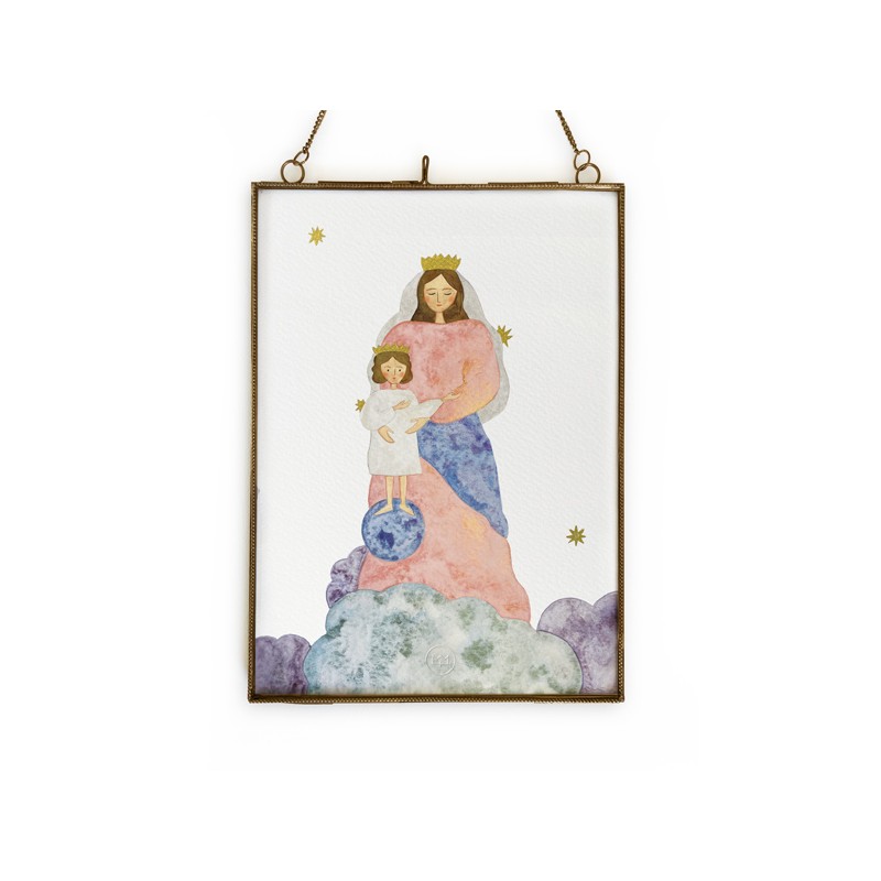 Ce cadre religieux en laiton doré met à l'honneur Notre-Dame des Victoires, dans une reproduction d’aquarelle pleine de douceur. La Vierge Marie y porte l’Enfant Jésus, debout sur un globe représentant le monde, sous un ciel étoilé. Une image de confiance, de paix et de tendresse.