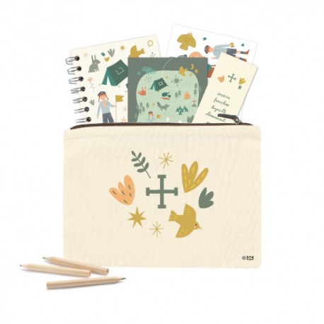 Grande pochette ou trousse multi-usage avec une jolie illustration graphique et joyeuse représentant le scoutisme et ses symboles. Idéal pour y glisser ses 5 objets, un carnet...nécessaires au louveteau, à la jeannette ou à la louvette. À glisser dans son sac scout ! - Coton écru naturel épais- Fermeture zippée- Dimensions : 18 x 25 cm ©...
