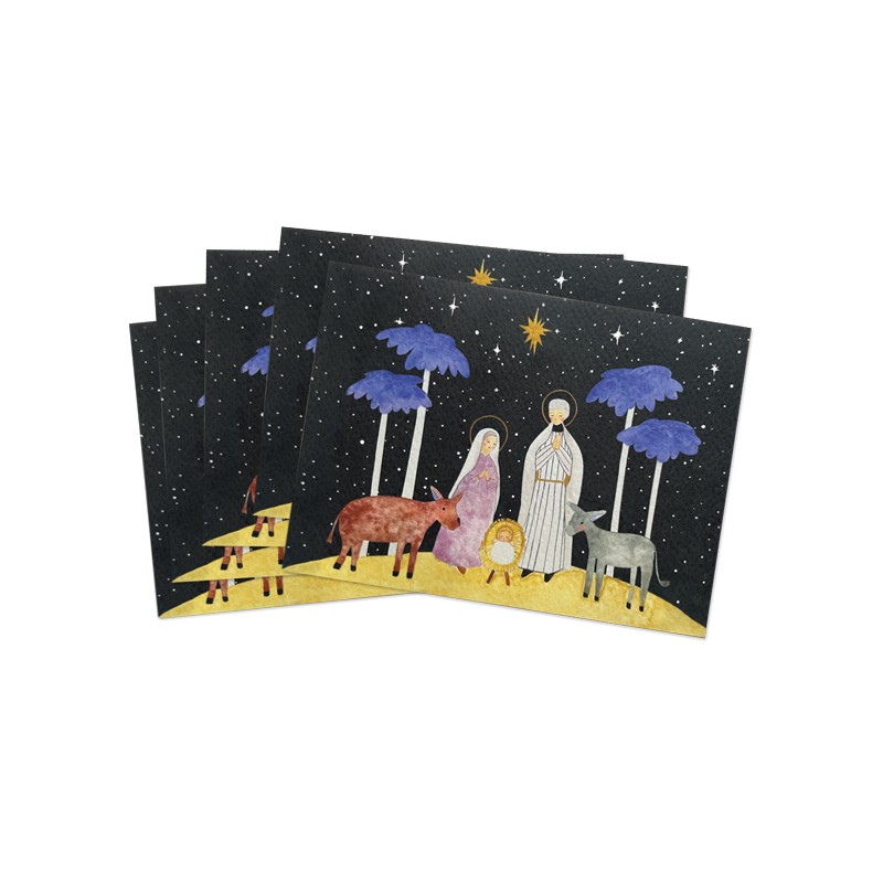 Ce lot regroupe cinq cartes de vœux représentant la scène de la Nativité peinte à l’aquarelle, avec la Sainte Famille réunie autour de l’Enfant Jésus sous un ciel étoilé. Les couleurs douces et la composition délicate évoquent la paix, l’espérance et la lumière qui rayonnent de la nuit de Noël.