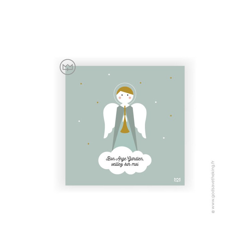 Cette grande carte, de la "collection Saintes et Saints" Godsavetheking, vous propose une version du Saint Ange gardien représenté en version design et stylisée. Dans le nuage il est écrit "Bon Ange Gardien, veillez sur moi". En arrière plan, il y a un ciel parsemé d'étoiles. L'Ange gardien, qui a une trompette dans ses mains, veille sur chacun de nous.