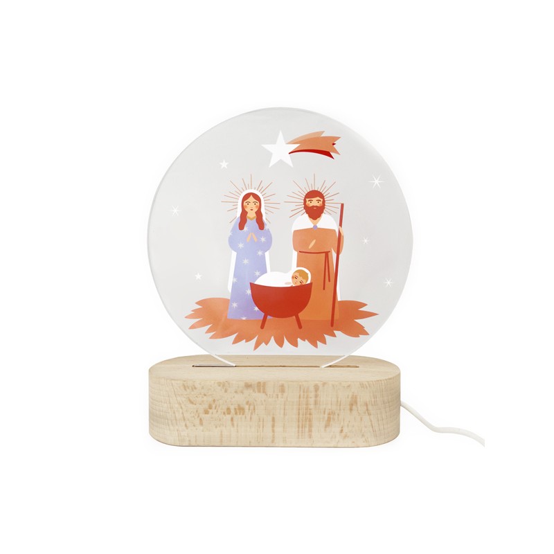 Apportez paix et clarté à votre intérieur avec cette veilleuse chrétienne Sainte Famille. La scène de la Nativité est finement gravée sur une plaque en plexiglass : la Vierge Marie, Saint Joseph et l’Enfant Jésus dans la mangeoire, sous l’étoile du berger et un ciel étoilé. Une représentation douce et lumineuse pour accompagner vos moments de prière et méditation.